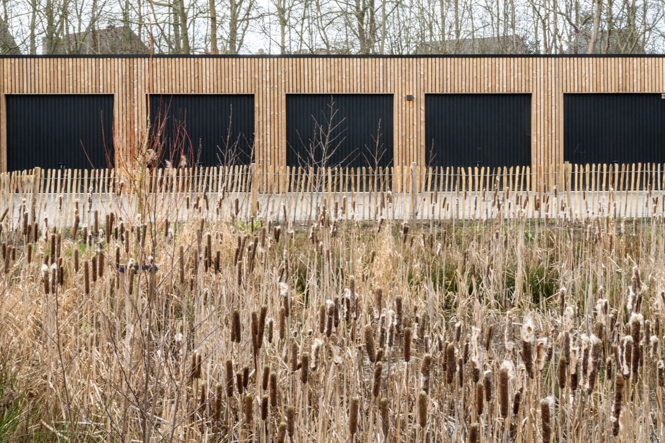 Daarnaast werd een carportstrook voorzien die, door de gekozen materialen, tevens dienst doet als geluidsmuur. De parkeerdruk in de wijk wordt zo niet verstoord en de houten façade van de carports vormt een esthetisch knap geheel met de woningen en het binnengebied. Bovendien werden deze carports toekomstgericht en met aandacht voor het klimaatprobleem ontworpen: we voorzagen fietsenbergingen, er is voor elke carport aansluitingsmogelijkheid voor een elektrische laadpaal en bovenop de carports werd een groendak voorzien.